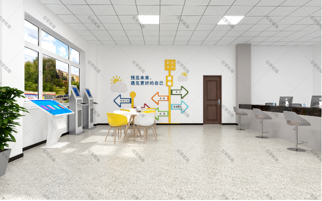 就业服务大厅设有交流讨论区、自助打印区和职涯咨询台,企业展示区和成果展示墙用于展示成果与企业信息 。AI 面试间、就业直播间、教研室、团体辅导室等功能区完善,大梯形拼接桌椅、梳妆台、全身镜等设施配备合理,文化墙和数字就业大屏增添空间功能性与美观性